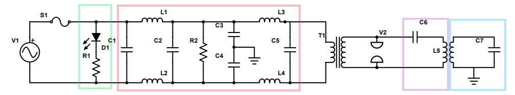 V1 is 120v RMS mains and S1 is a 20 amp fuse. Boxed in green is the power indicator, and boxed in red is the Electromagnetic Interference (EMI) filter. The EMI filter is not included in most schematics but is actually a pretty important component of the spark gap tesla coil to not forget! It acts as a low-pass filter to prohibit any current or voltage spikes from returning to the wall! It is crucial to include this in the wiring diagram.