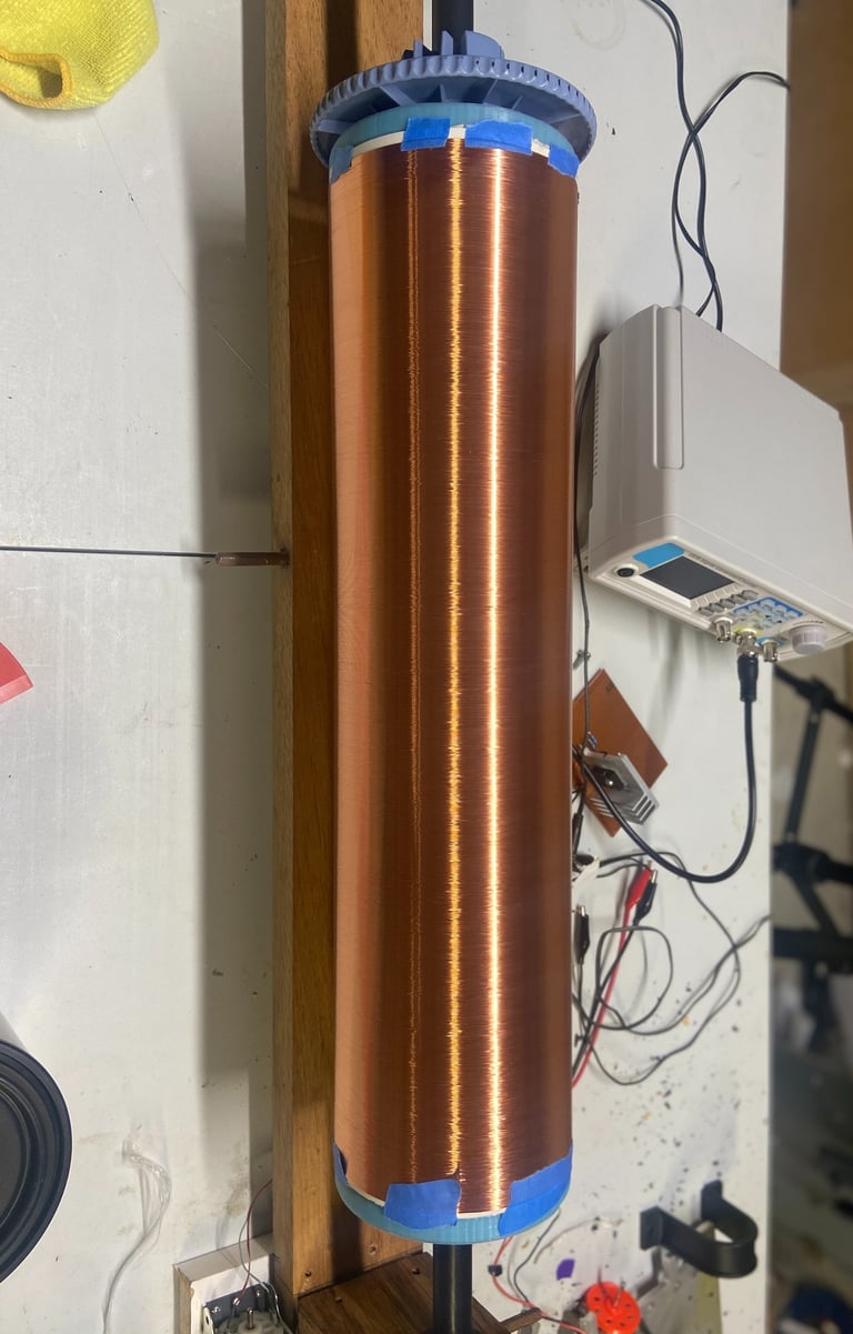 Once the wire and PVC pipe (I would use tubing in hindsight) were on hand, most of the setup time was spent creating a motor driver circuit from a signal given by a function generator and creating the physical apparatus to spin the coil on. I even 3D printed glow in the dark endcaps to see if I could capture the arc striking in the glow of the filament later! If one desired to wind the coil by hand, they would be in for a world of prolonged torture. Thus, it is almost essential to create a sort-of makeshift lathe and setup to coil to guide the wire when wrapping it around.